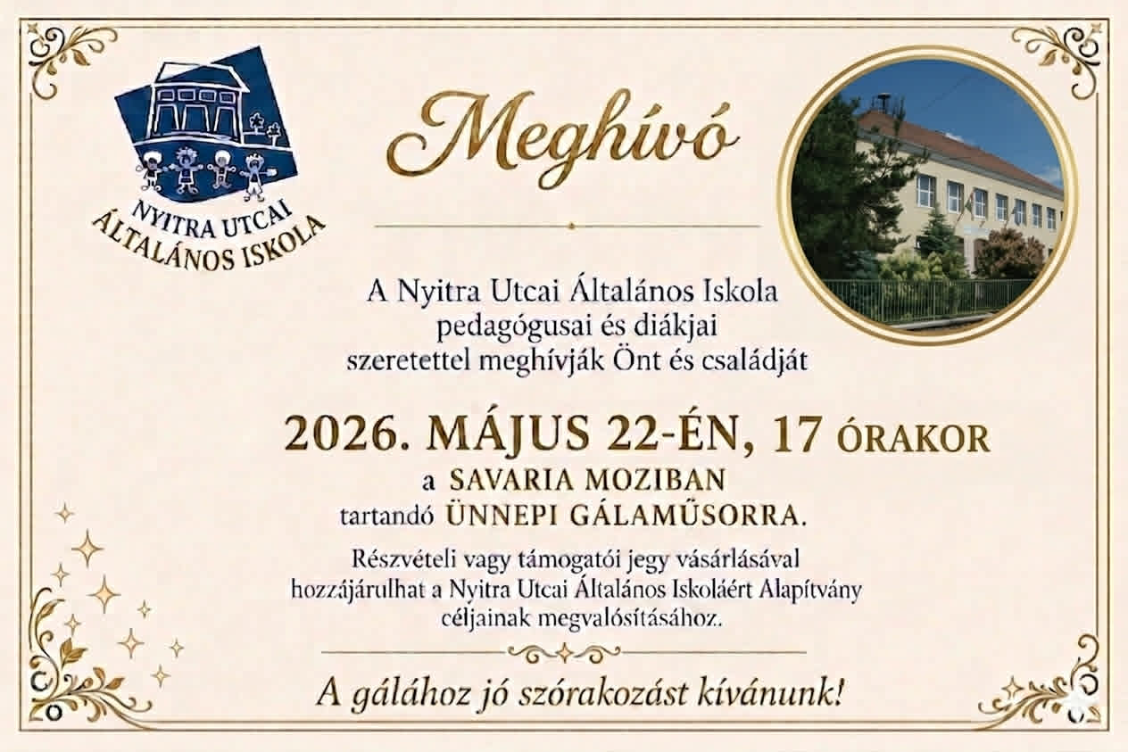 Örömmel tájékoztatjuk Önöket, hogy a Nyitra Gálát 2026. május 22-én rendezzük meg a Savaria Moziban, ahol iskolánk diákjai lépnek fel.